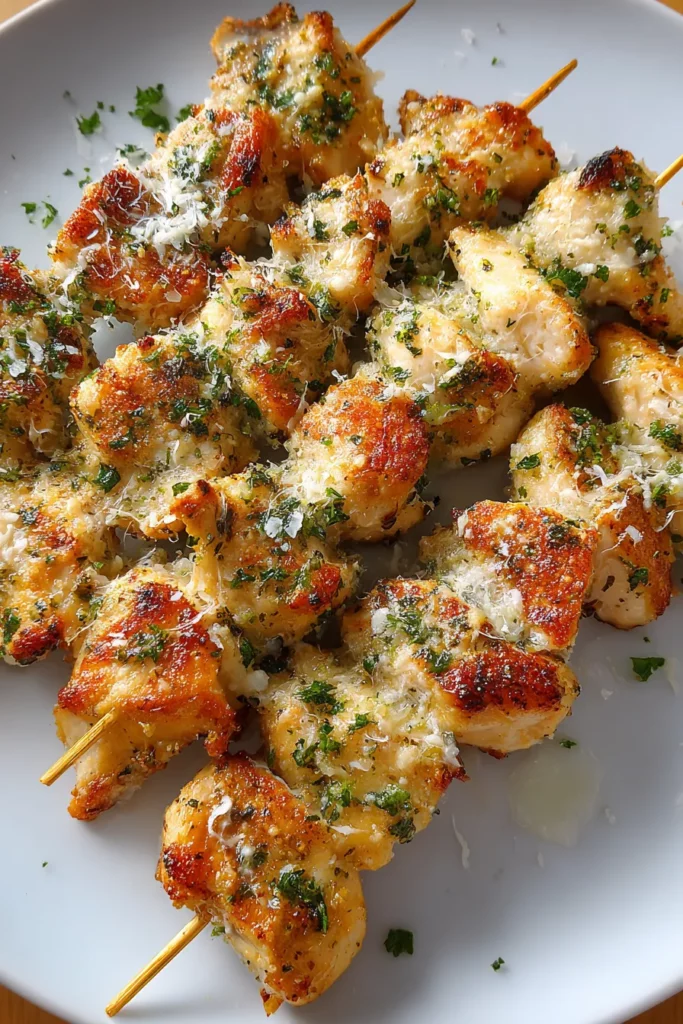 Serve immediately and enjoy your delicious Air Fryer Garlic Parmesan Chicken Skewers!