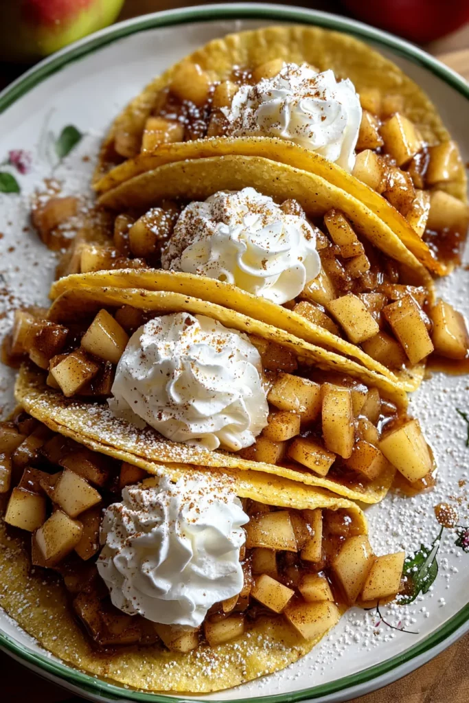 Imagine biting into a warm, crispy taco shell filled with tender, spiced apples and topped with creamy whipped cream or a scoop of ice cream. A dessert that feels like a cozy hug!