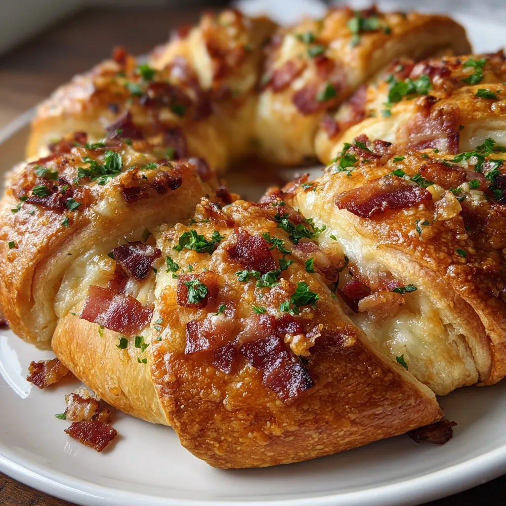 A crisp, golden wreath of buttery crescent dough bursting with gooey Brie, savory bacon bits, and crunchy walnuts. A whisper of honey and fresh parsley adds sweet and herbal notes, perfect for gatherings or holiday tables.