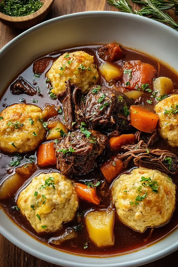 There’s something undeniably comforting about a steaming bowl of beef stew topped with fluffy, cloud-like dumplings that makes you feel right at home. Tender cubes of beef, bathed in a rich tomato-and-wine-infused broth, mingle with sweet carrots, earthy celery, and soft potatoes, creating a symphony of flavors and textures that warms you from the inside out. Each spoonful offers a hearty taste of slow-cooked goodness: the beef yields under the fork, the vegetables hold just enough bite, and the silky broth carries hints of thyme, rosemary, and Worcestershire sauce. When those dumplings rise to the occasion on top, they soak up the savory juices and puff into little pillows of satisfaction, making each mouthful a delightful contrast of tender meat and pillowy dough.