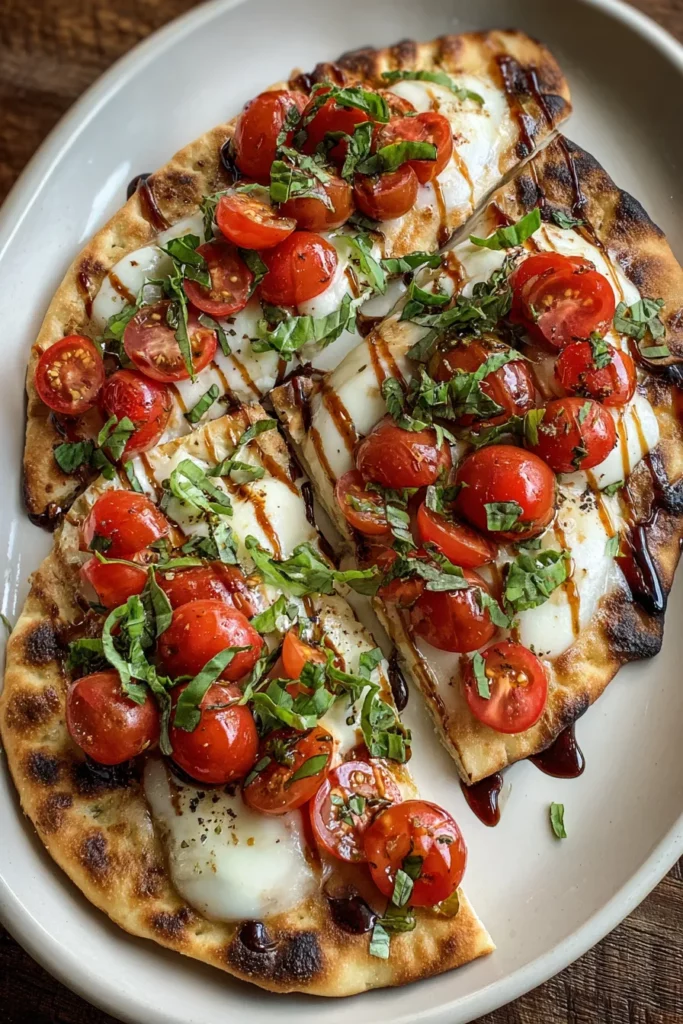 Bruschetta Flatbread with Naan, Tomatoes, Basil, and Mozzarella