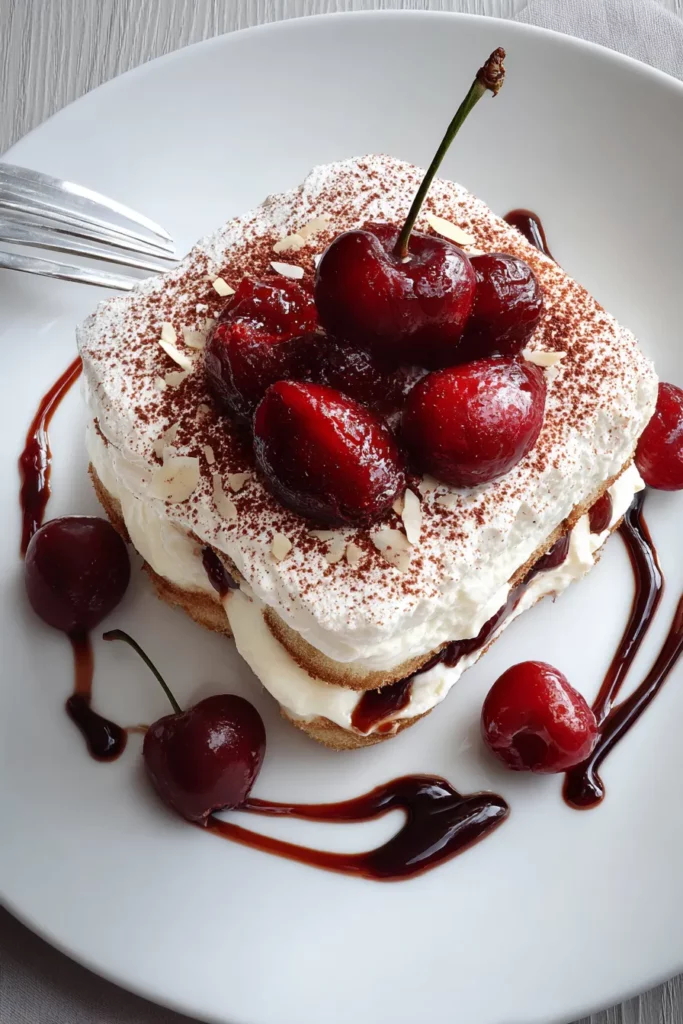 Creamy mascarpone whipped to cloudlike peaks mingles with sweet cherries and a warm almond liqueur drizzle. Ladyfingers soaked in coffee and Amaretto create a luscious, layered dessert that’s vibrant, rich, and unforgettable.
