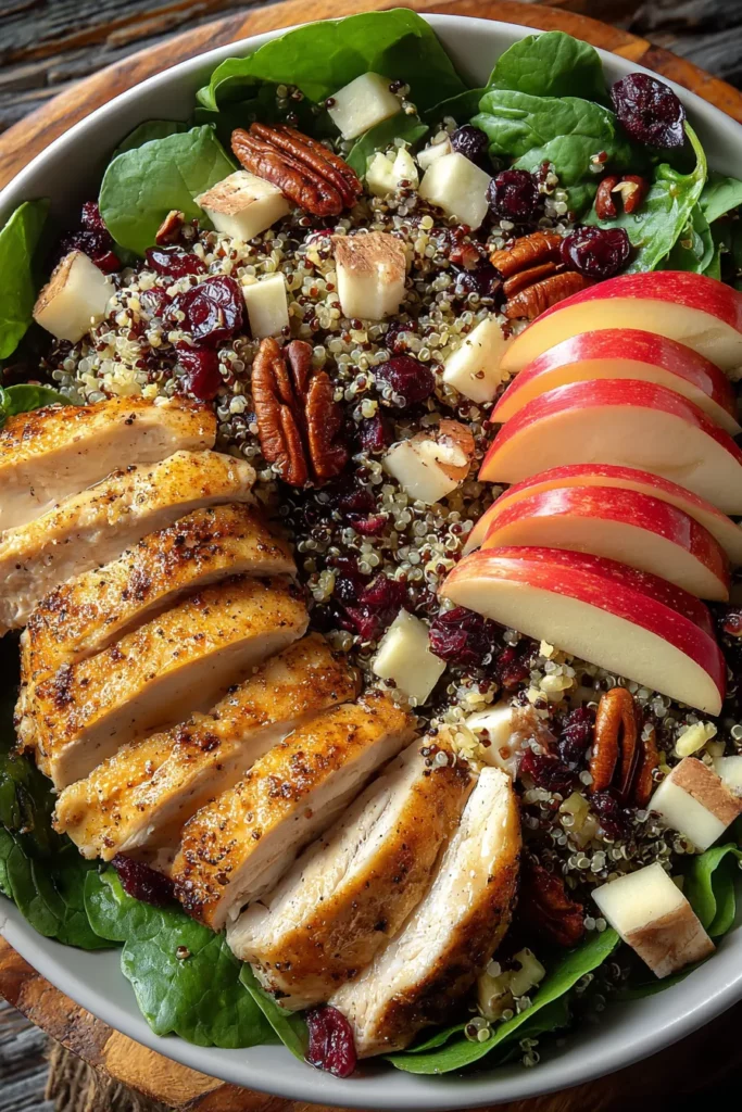 Layer the salad components in glass jars—dressing at the bottom, followed by quinoa, apples, cranberries, pecans, feta, and mixed greens. Top with sliced chicken. Seal and refrigerate for grab-and-go lunches that look as pretty as they taste.