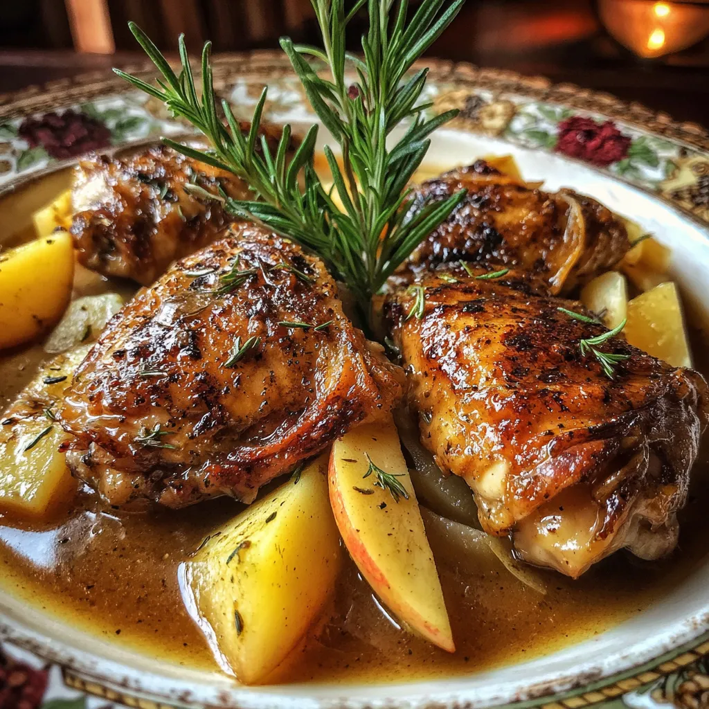 Tender chicken thighs seared to golden perfection, simmered in fragrant apple cider with rosemary and cinnamon, then roasted alongside crisp apple slices for a warm, cozy holiday aroma.