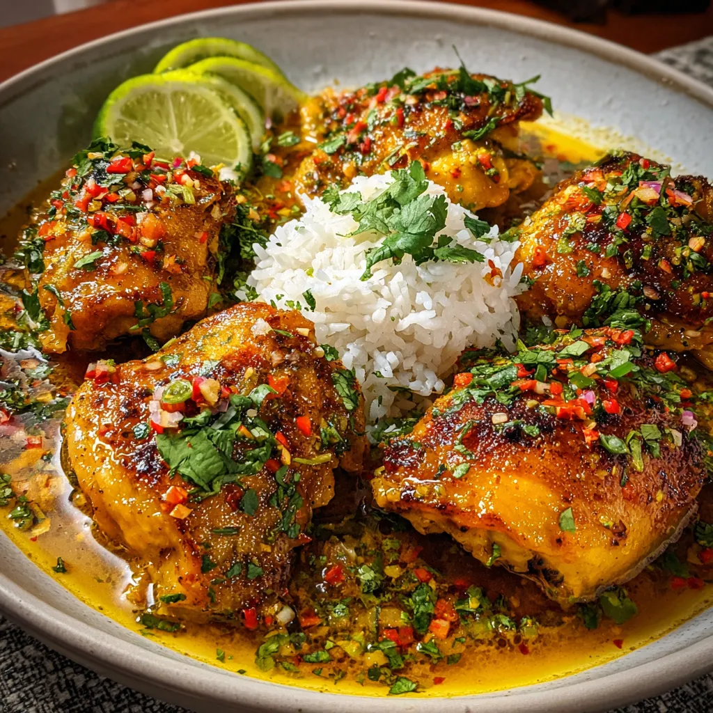 Juicy chicken thighs soak up a vibrant blend of aji amarillo, garlic, and ginger. After searing, they simmer in rich broth, then are brightened with lime and cilantro for a spicy, tangy finish.