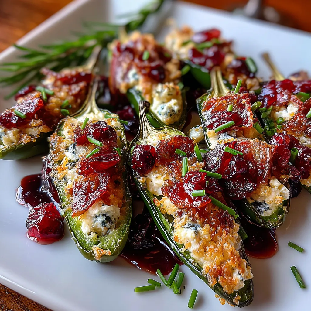 Soft Brie and tangy cream cheese fill blistered jalapeños, crowned with cranberry sauce and crunchy bacon. Each bite bursts with creamy, spicy, and sweet flavors, finished with chives for a festive touch.
