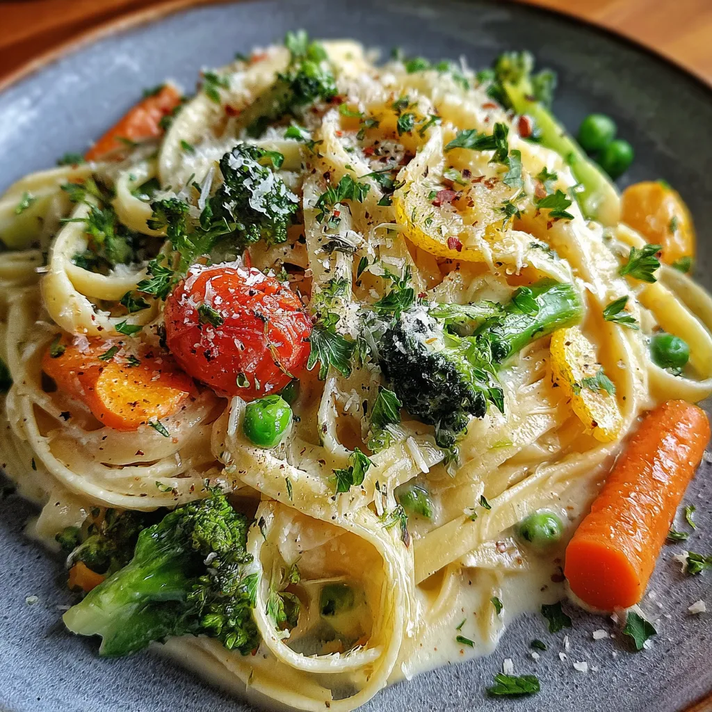 Bright broccoli, sweet carrots, and juicy cherry tomatoes mingle in a lusciously smooth garlic-parmesan cream that clings to tender fettuccine, while a hint of red pepper and lemon juice lifts each mouthful.