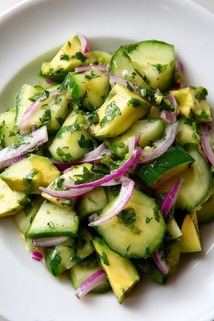 Crisp cucumber meets buttery avocado in a lime-cilantro dressing, studded with red onion and optional jalapeño for a refreshing, flavor-packed salad perfect for summer gatherings.