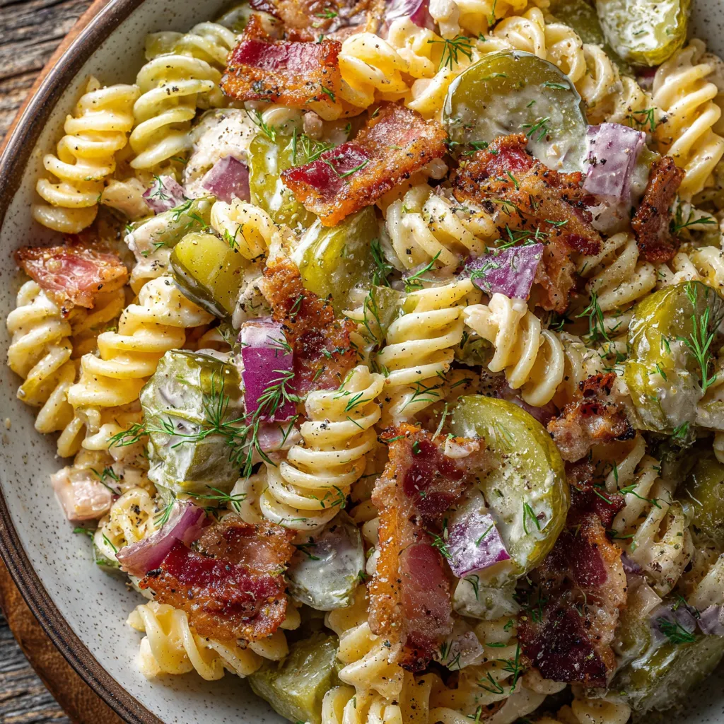 Creamy rotini and chopped pickles meet crisp bacon and crunchy celery, all tossed in a zesty dill-infused dressing. This chilled salad bursts with flavor and makes a perfect make-ahead side for summer barbecues or weeknight meals.