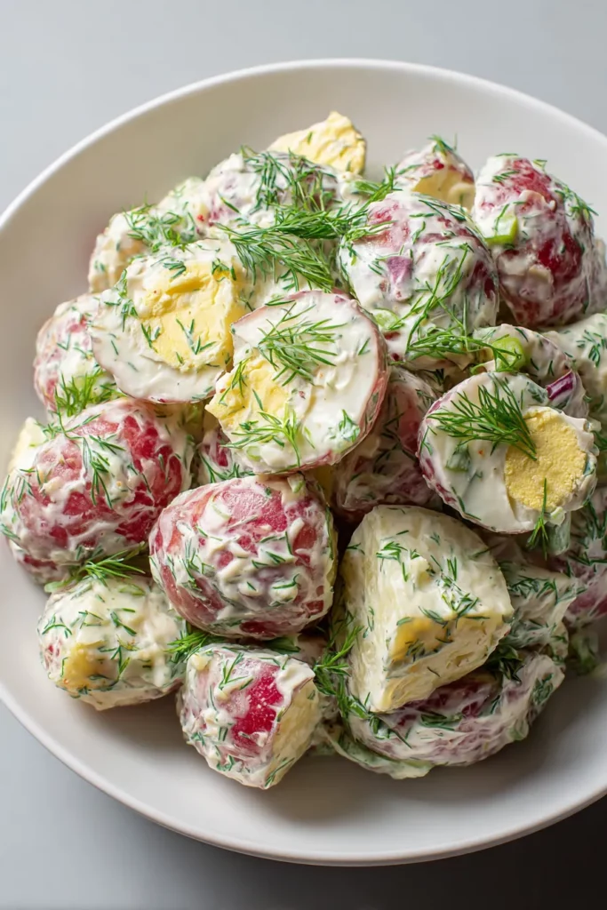 Every mouthful delivers a satisfying contrast of textures: the slight snap of the potatoes’ skins against the creamy dressing, the gentle crunch of onions, and the soft, feathery bursts of dill that glide across your palate. Whether you’re a seasoned home cook or a complete beginner, this recipe will have you feeling like a kitchen rock star. It’s also wonderfully versatile—tweak the tang level with extra apple cider vinegar, swap in Greek yogurt for a lighter twist, or leave the skins on the potatoes for an extra rustic touch. Once chilled, the flavors meld into an irresistible symphony that will have everyone reaching for seconds.
