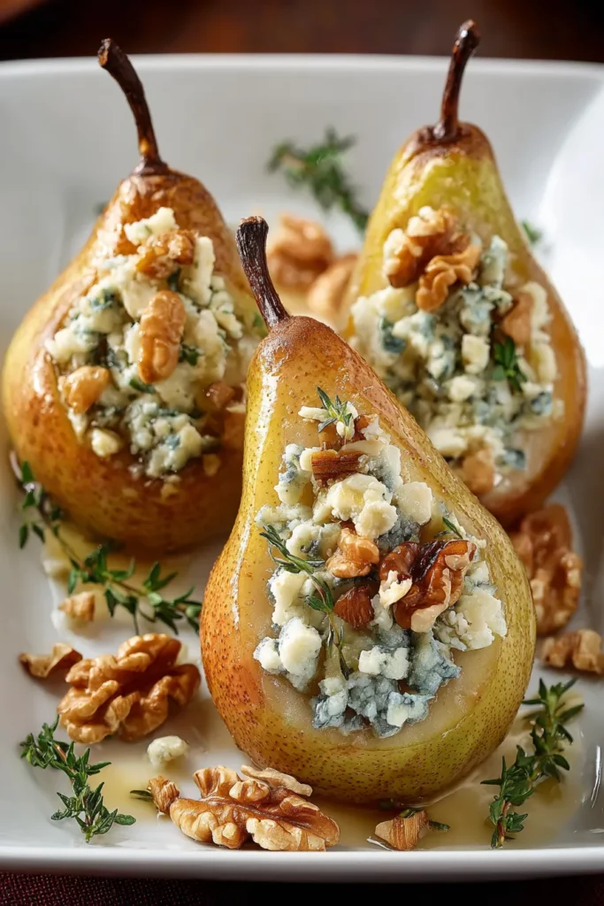 Sweet Bosc pears roasted until tender cradle a bold blue cheese and walnut filling, drizzled with balsamic glaze and thyme for a gourmet bite.