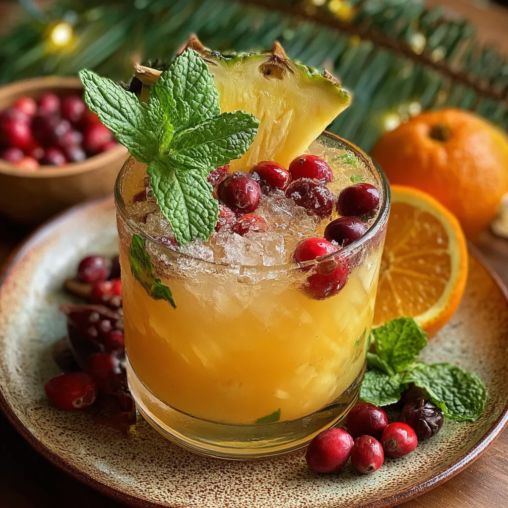 6. Garnish with a sprig of fresh mint, a few fresh cranberries, a slice of pineapple, and a wedge of orange for festive color and aroma.