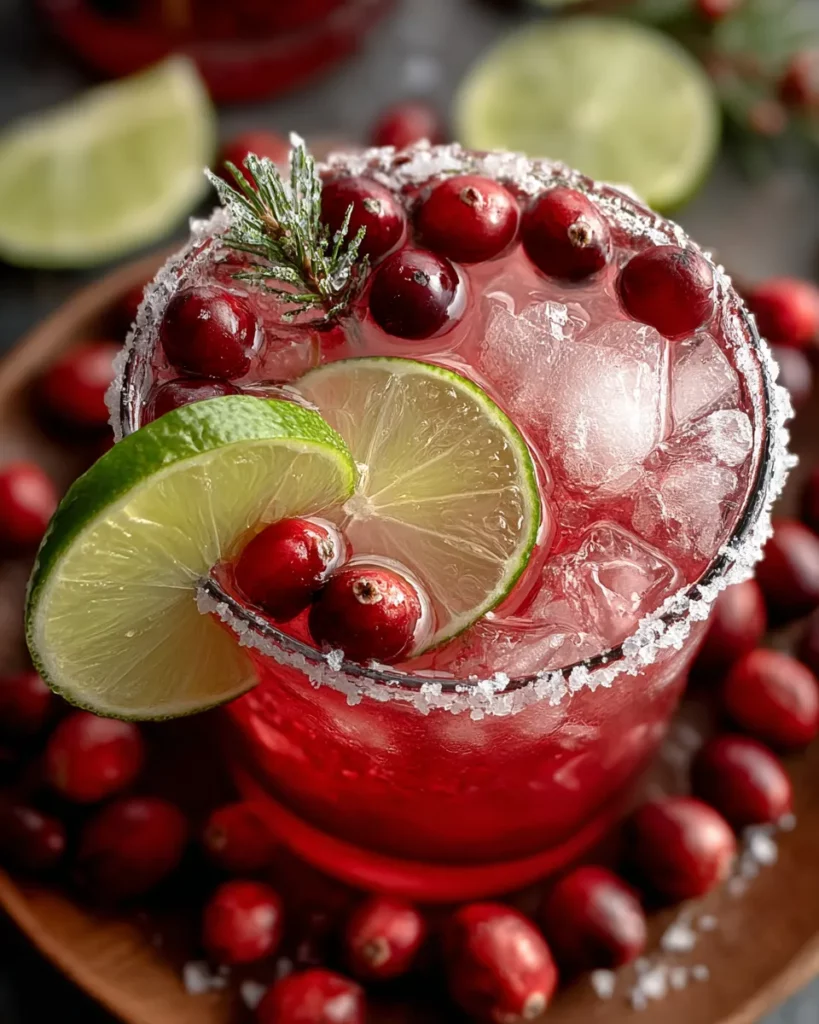 Garnish with a few fresh cranberries and a lime wedge on the rim. If desired, add a sprig of mistletoe for a festive touch.
