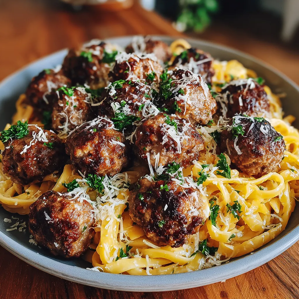 Tender beef and pork meatballs seared until golden release garlicky juices into a lush butter-Parmesan cream sauce that clings to each strand of spaghetti, finished with bright parsley.