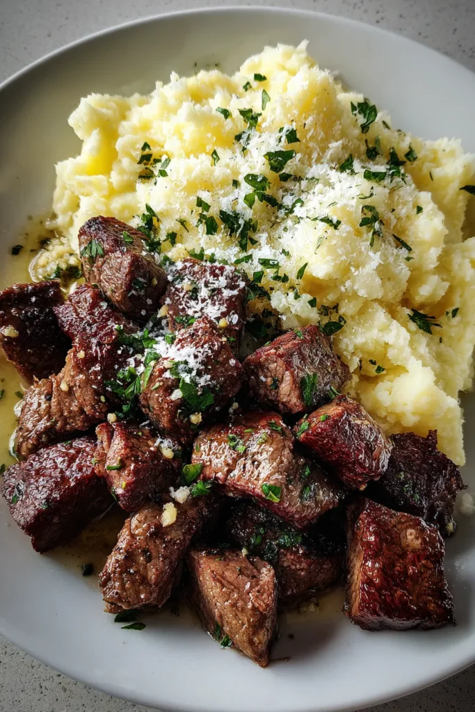 Garlic Parmesan Steak Bites with Mashed Potatoes