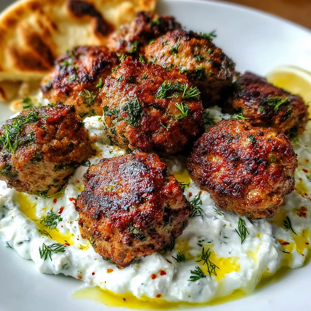 Golden-brown turkey meatballs bursting with garlic, mint, and oregano, paired with a chilled, creamy cucumber-dill tzatziki that adds a cool, tangy contrast.