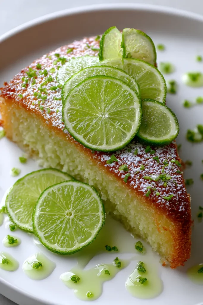 Dust your serving plate with powdered sugar or a bit of extra lime zest. Place the slice at an angle, and finish with thinly sliced lime wheels or edible flowers to achieve a fancy patisserie look.