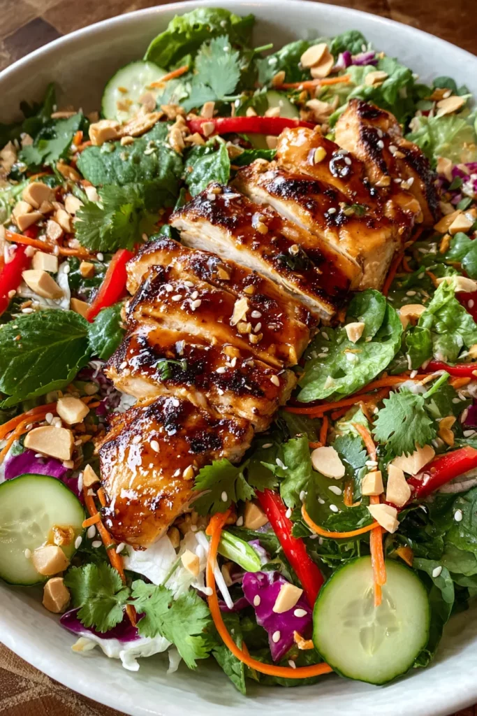 Every great dish starts with star ingredients that each play their part in creating layers of flavor, texture, and color. In this salad, we’re combining juicy grilled chicken with crisp vegetables, aromatic herbs, and a tangy-sweet dressing that ties it all together. Below are the essentials that make this recipe shine.