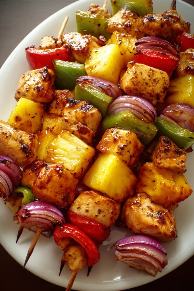 Experience juicy chicken cubes marinated in honey, soy, and pineapple juice, skewered with vibrant peppers and pineapple chunks. Grill to charred perfection for a sweet, tangy, and savory tropical feast!