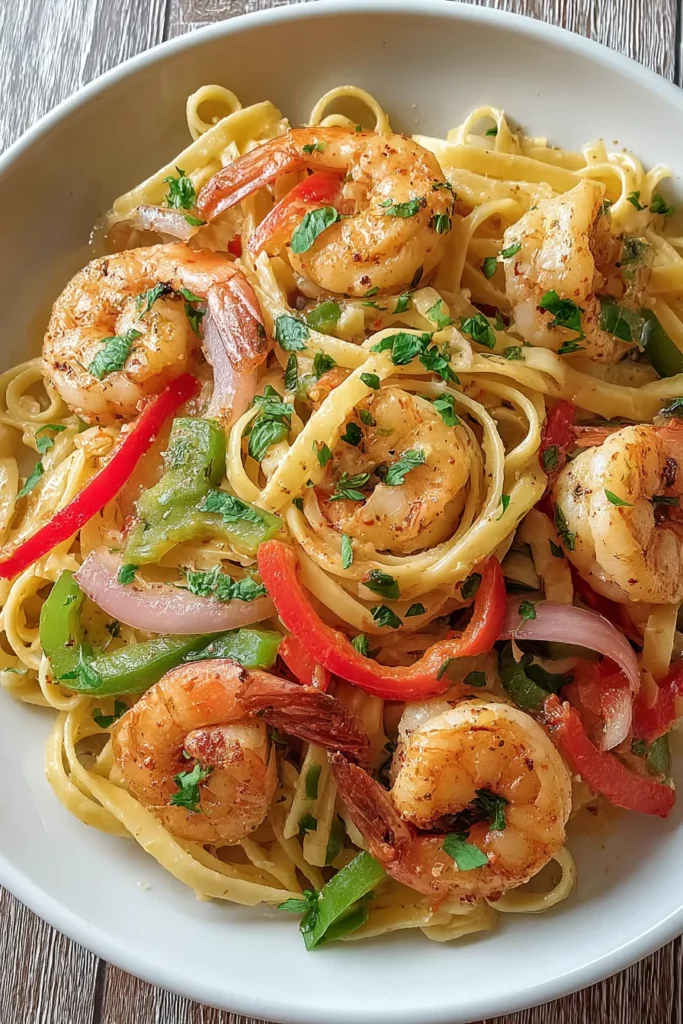 This Jamaican Shrimp Pasta features succulent shrimp, colorful peppers, and a creamy coconut sauce, bringing together a delightful mix of spices and tropical flair.