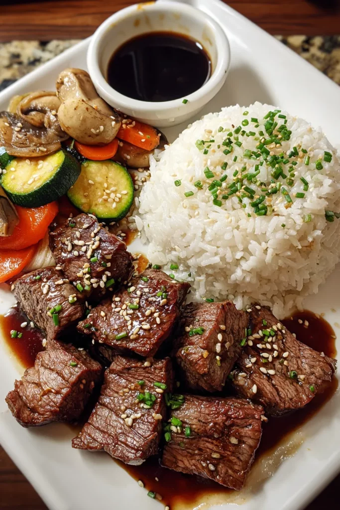 Experience tender cubes of soy-sesamemarinated steak seared with garlic, buttered veggies, and a hint of sesame. Served over fluffy rice and garnished with green onions and sesame seeds for a savory, home-grilled taste.