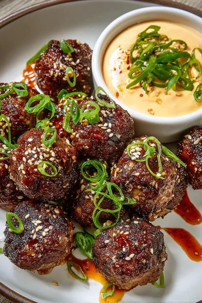 Arrange the meatballs on a large platter with the spicy mayo dip in a central bowl. Garnish with extra chopped green onions and sesame seeds for a festive touch—perfect for cocktail parties or game nights.