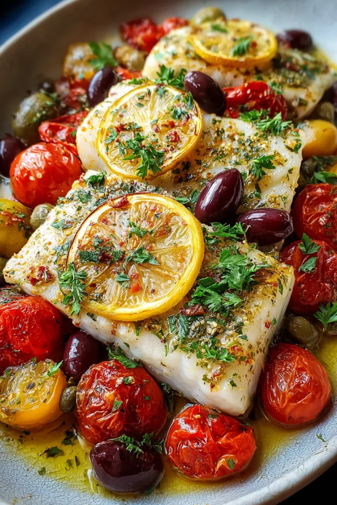 The Mediterranean Baked Fish recipe is an invitation to bring a slice of sun-drenched coastlines into your own kitchen. Bursting with tangy lemon, juicy cherry tomatoes, briny olives, and delicate white fish, it’s a symphony of flavors that feels both gourmet and effortlessly simple. This dish thrives on fresh ingredients and bold seasonings, making every bite vibrant and memorable. Whether you’re craving a light weeknight dinner or hosting friends for a casual gathering, this recipe fits the bill. As someone who loves experimenting with fresh herbs and colorful produce, I can’t help but smile when that sweet garlic-infused olive oil mingles with bright capers and thyme.