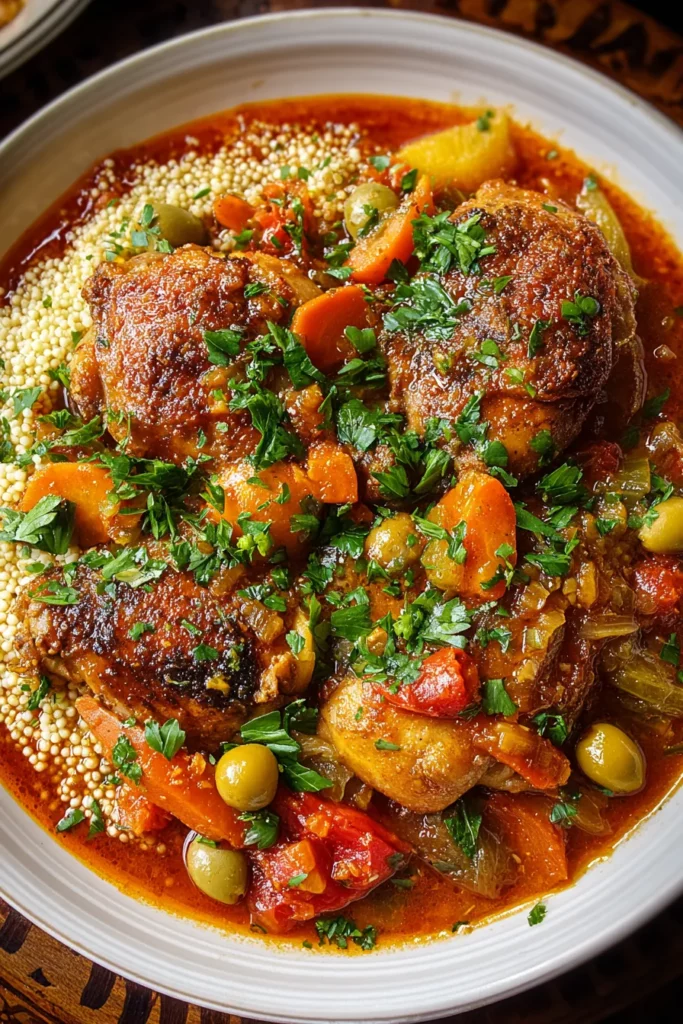 Serve the stew over a bed of light, steamed couscous. Fluff the grains with a fork and drizzle a little olive oil before plating to prevent clumping. The couscous soaks up the aromatic sauce beautifully.
