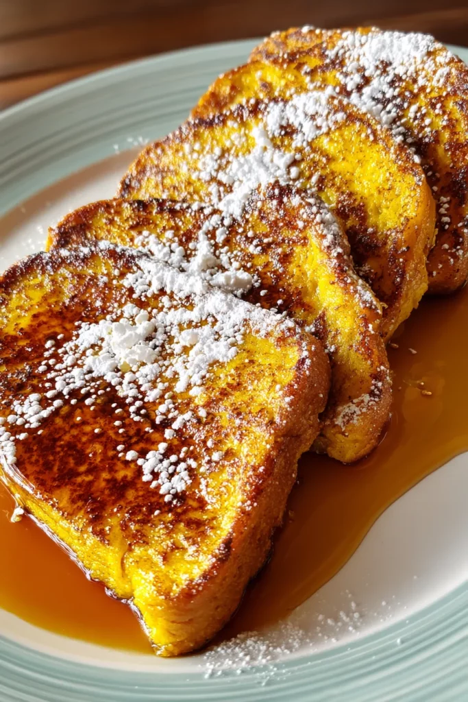 6. Serve your Pumpkin French Toast warm with a generous drizzle of maple syrup, a light dusting of powdered sugar, or a fluffy dollop of whipped cream on top for an extra touch of sweetness.