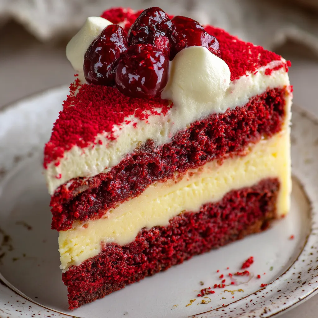 Tender red velvet cake layers cradle a rich, creamy cheesecake center, all smothered in tangy cream cheese frosting. Each slice boasts moist cocoa flavor, a hint of vanilla, and a luscious, melt-in-your-mouth texture.