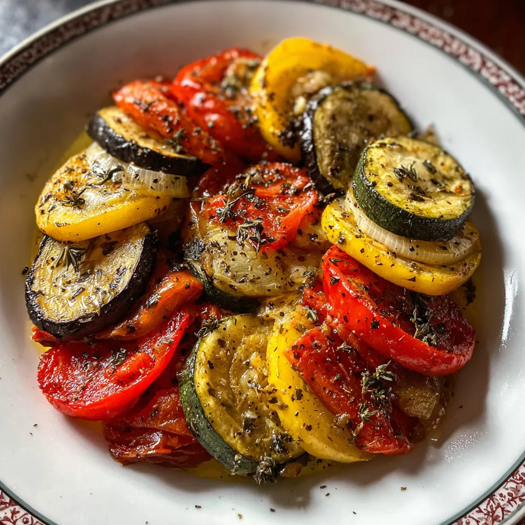 A rainbow of tender zucchini, eggplant, peppers and tomatoes roast in olive oil and aromatic Provençal herbs, releasing caramelized sweetness and savory summer aromas.