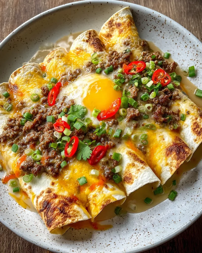 Enjoy the delightful combination of fluffy scrambled eggs, savory sausage, and melted cheddar wrapped in warm tortillas, topped with creamy sausage gravy that brings comfort and joy to your breakfast table.