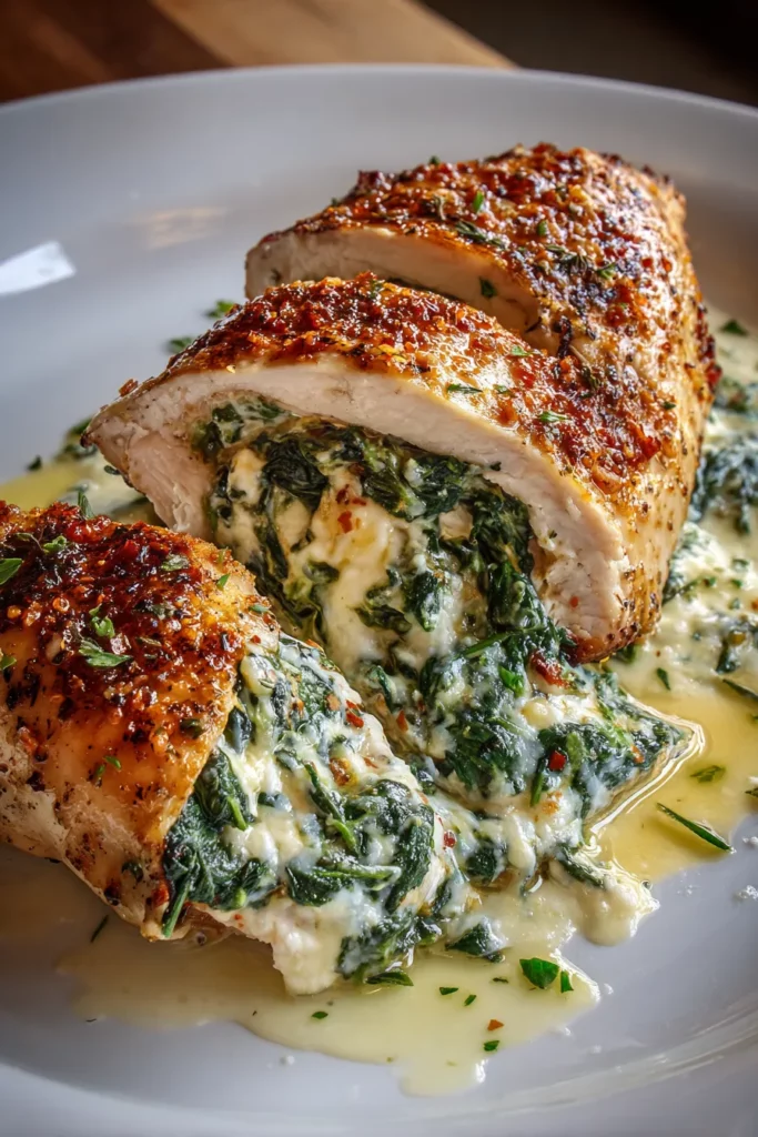 Tender chicken breasts filled with a creamy blend of spinach, Parmesan, and mozzarella, baked to golden perfection. Each bite offers savory, cheesy goodness with a hint of garlic and red pepper heat.