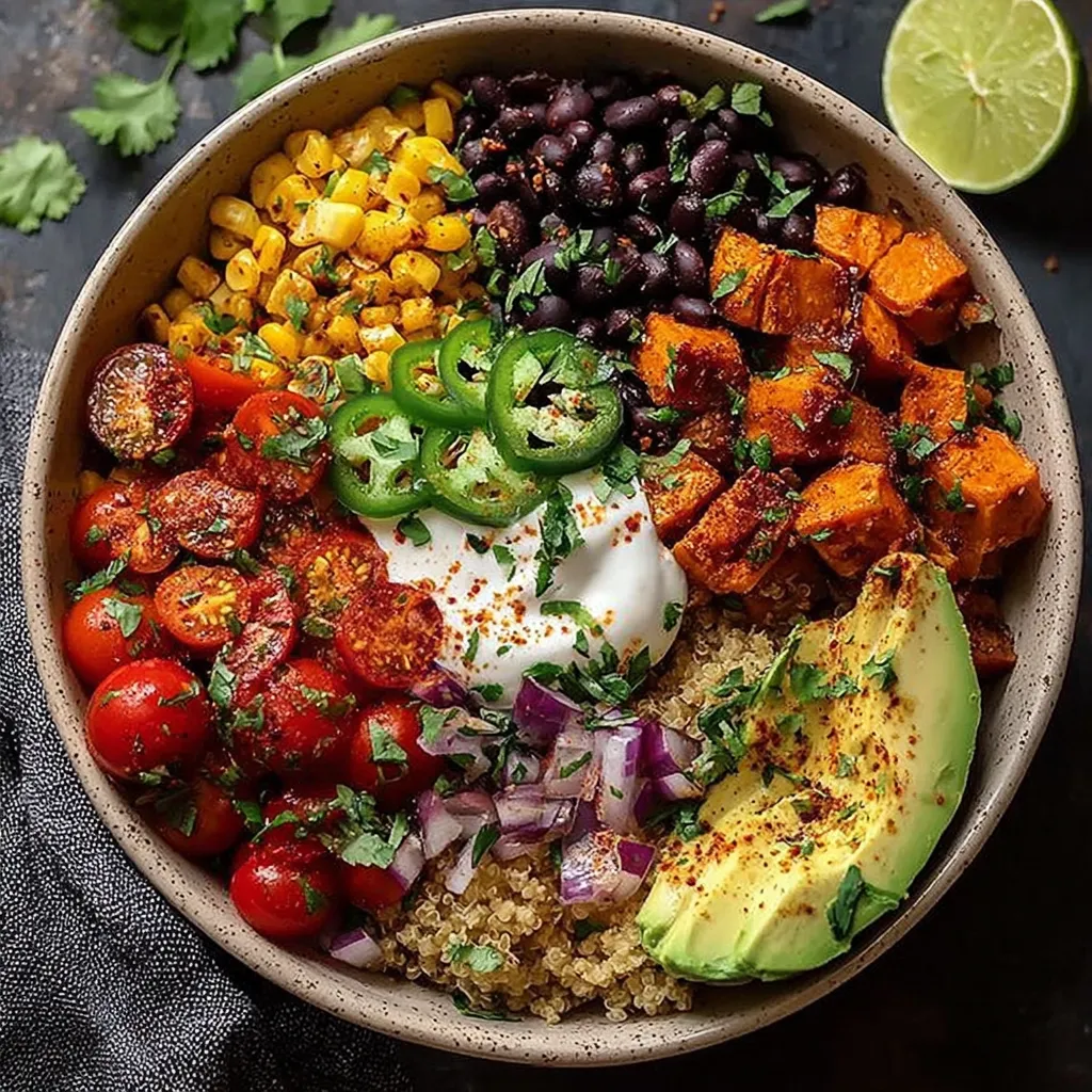 Roasted sweet potatoes get a smoky chili rub, tossed with fresh black beans, corn, bell peppers, and bright lime juice, then topped with creamy avocado and cilantro for a satisfying bowl.