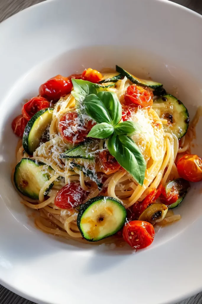 Experience tender zucchini ribbons and juicy tomatoes enveloped in al dente pasta, kissed with garlic and Parmesan for a comforting, colorful dish that’s perfect for warm nights.