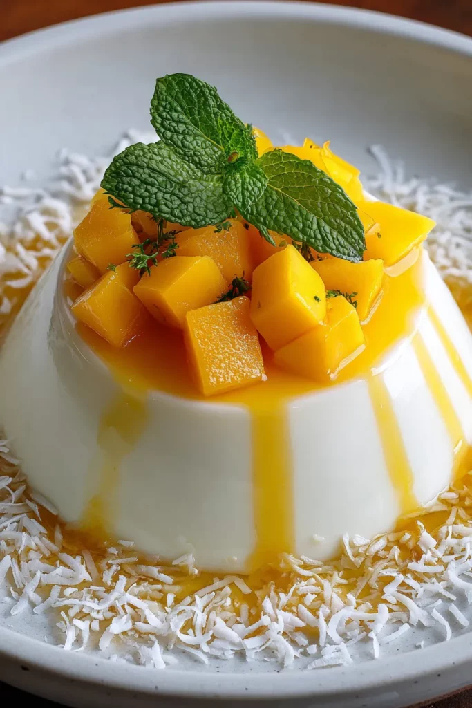Once the panna cotta has set, garnish with fresh mint leaves and shredded coconut if desired.