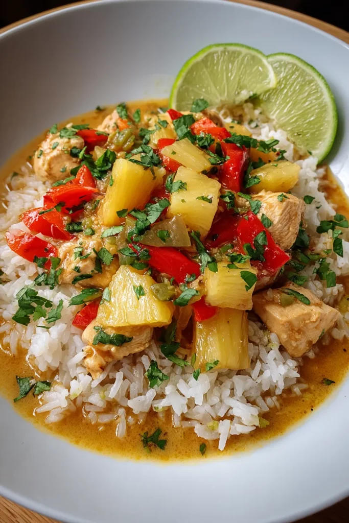 Arrange the fluffy jasmine rice in a neat mound on each plate, then spoon the chicken and pineapple mixture beside it. Garnish with a few cilantro leaves on top of the rice and tuck a lime wedge alongside for a visually appealing contrast of green, white, and golden hues.