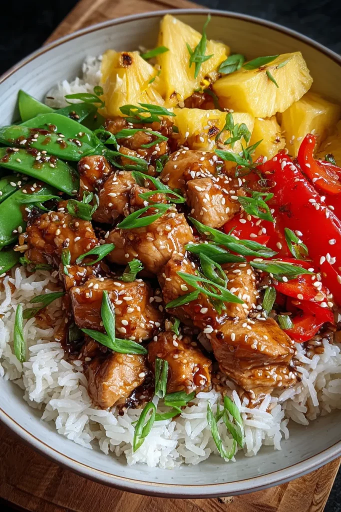This Tropical Teriyaki Chicken Rice Bowl is a testament to how simple ingredients can transform into a vibrant, flavor-packed meal. From the first step of marinating tender chicken in a fragrant teriyaki sauce to the moment you sprinkle on green onions and toasted sesame seeds, every action builds a harmony of sweet, savory, and tropical notes. The creamy coconut jasmine rice serves as the perfect foundation, soaking up the sweet pineapple juices and umami-rich stir-fry. With just 60 minutes from start to finish, even busy weeknights can feel like a mini celebration. Whether you’re cooking for family, hosting friends, or meal-prepping for the week ahead, this recipe delivers on both taste and ease—ideal for beginner cooks and experienced chefs alike.