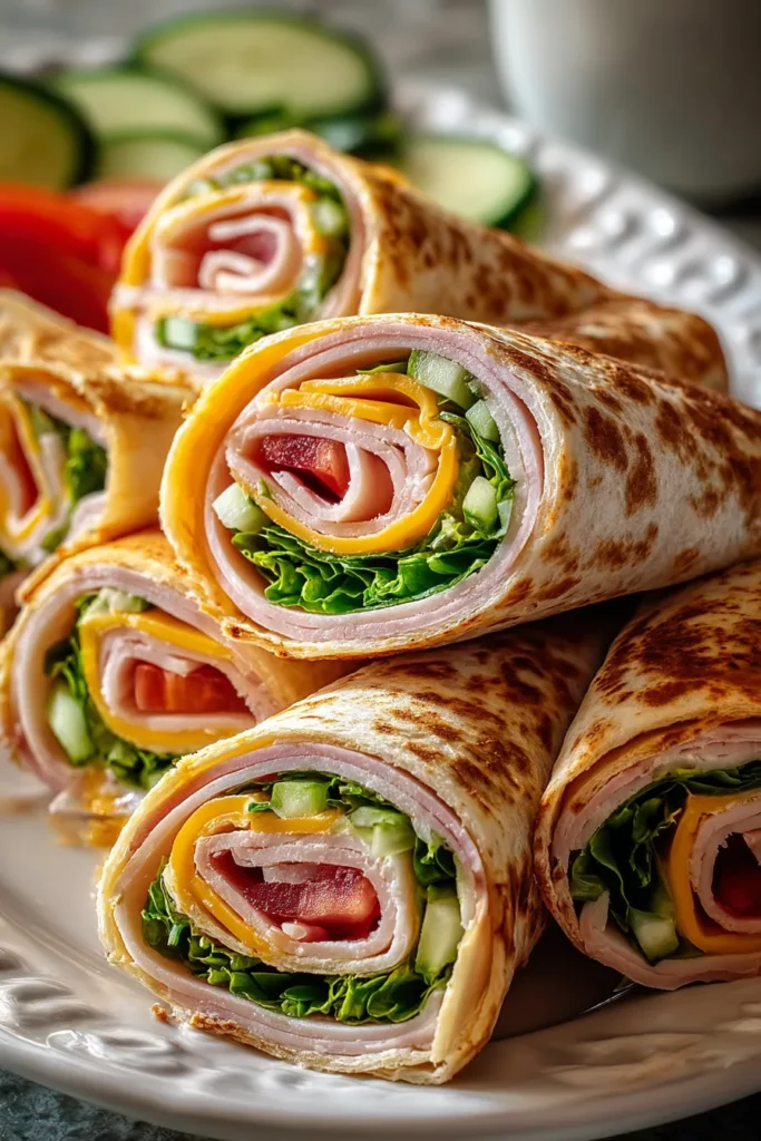 These Turkey & Cheddar Roll Ups are the perfect handheld bites, loaded with savory deli turkey, creamy cheddar, and fresh veggies, all wrapped up in a soft tortilla. Ideal for lunch or a snack on the go!