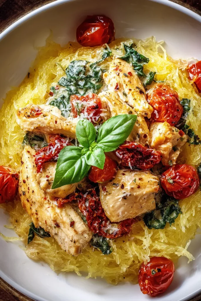 Experience the robust flavors of Tuscan cuisine with tender chicken in a creamy sauce, paired with roasted spaghetti squash for a healthy twist. It's utterly satisfying!