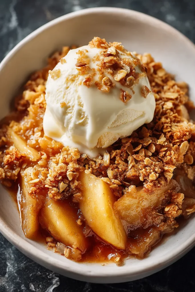 A generous scoop of cold vanilla ice cream melts into the warm apple crumble, creating a luscious contrast of temperatures and textures. Serve immediately so the ice cream forms delicate rivulets down the crisp oat topping.